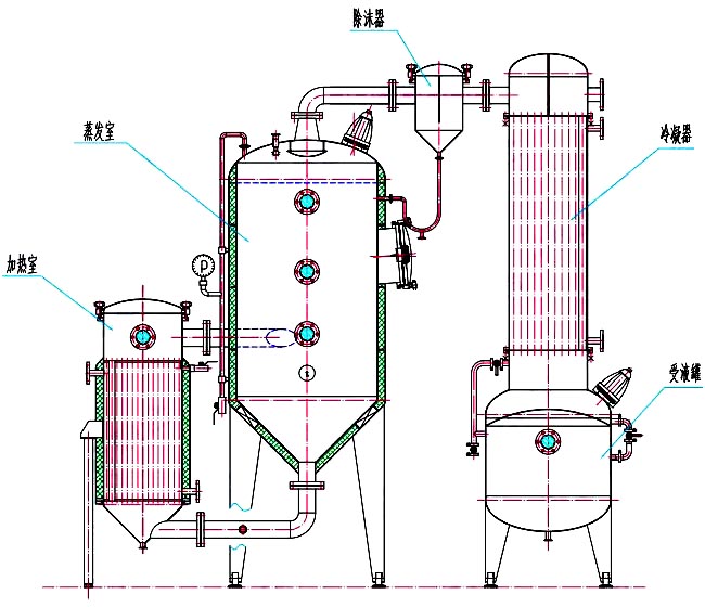 單效外循環(huán)真空濃縮器,由加熱器、蒸發(fā)器、除沫器、冷凝器、冷卻器、受液罐等組成,凡與物料接觸部件均采用優(yōu)質不銹鋼制作,本設備